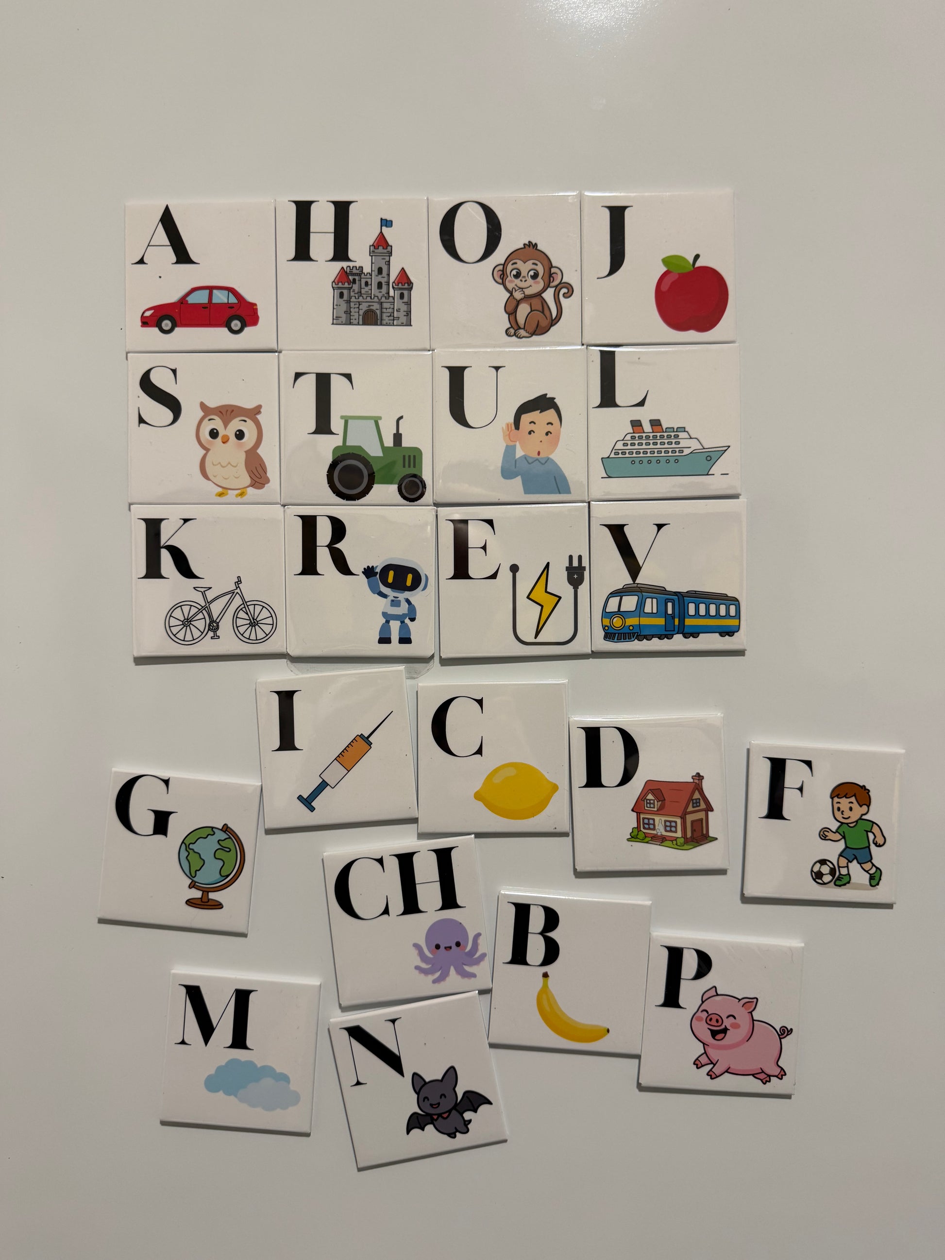 Tato magnetická sada obsahuje 30 pečlivě navržených magnetek s písmeny a obrázky, které dětem pomáhají spojit písmeno se slovem a významem. Díky tomu si abecedu zapamatují rychleji a s radostí.
